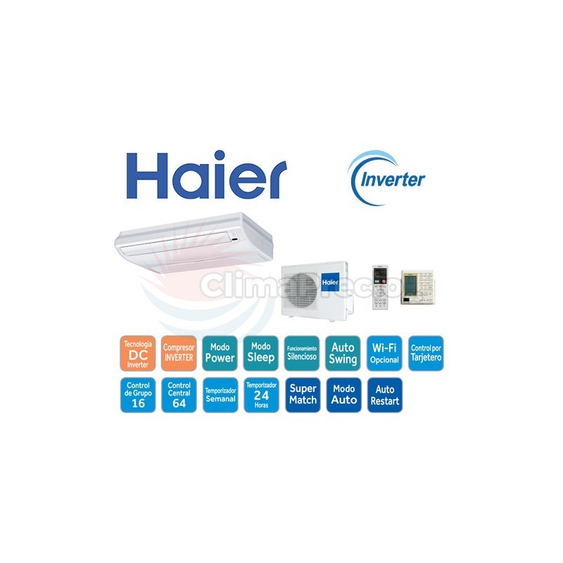 Haier AC48FS Techo (Trifásica) Aire acondicionado tipo Techo Inverter. Clase A. Potencia frigorífica 10.748 (kcal/h) (12.500W) Potencia calorífica 12.124 (kcal/h) (14.100W). 2 Años de garantía TOTAL. Trifásica