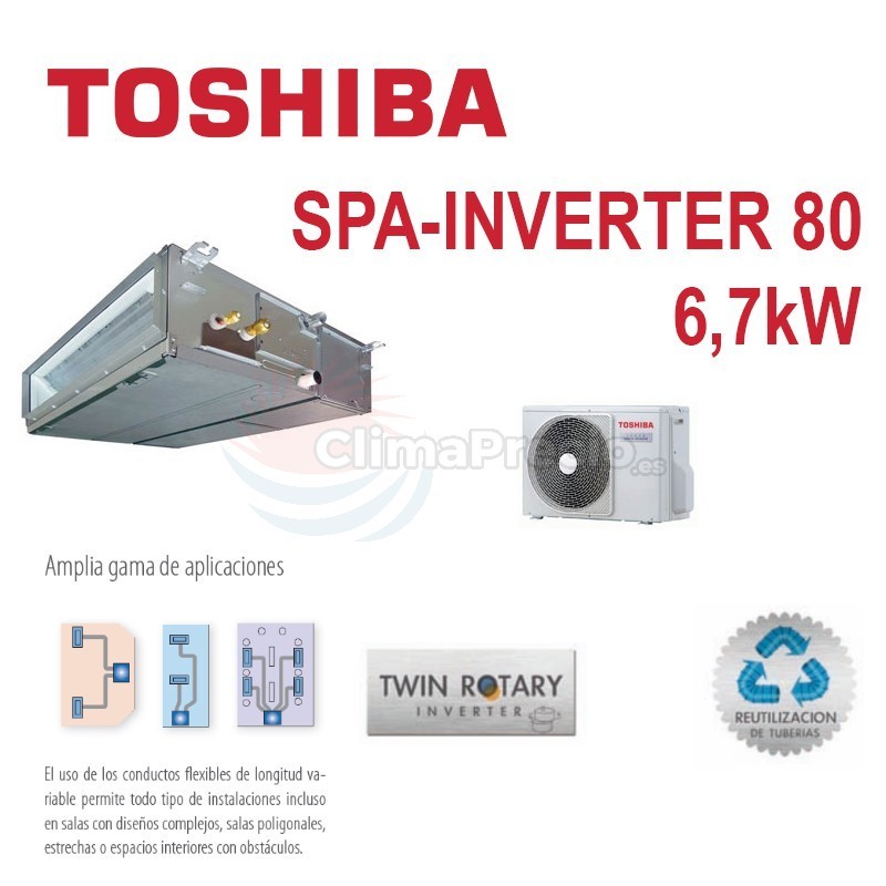 Toshiba SPA Inverter 80 Conductos Aire acondicionado R32 tipo Conducto Inverter. Clase A/A+. Capacidad frigorífica 5.762 fg/h.; Capacidad calorífica 6.622 Kcal/h. 3 Años de garantía TOTAL. ENVIO A BALEARES INCLUIDO